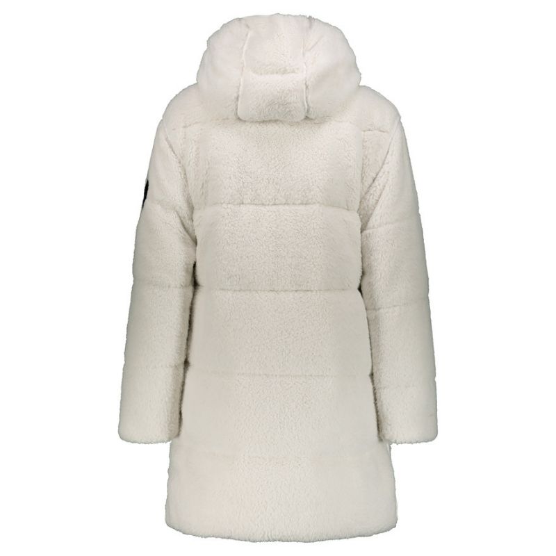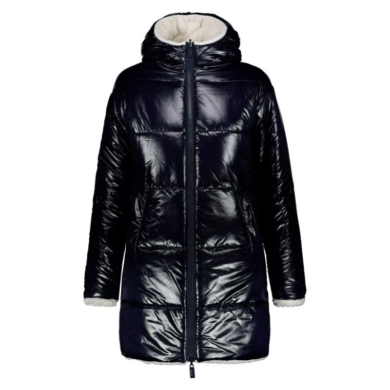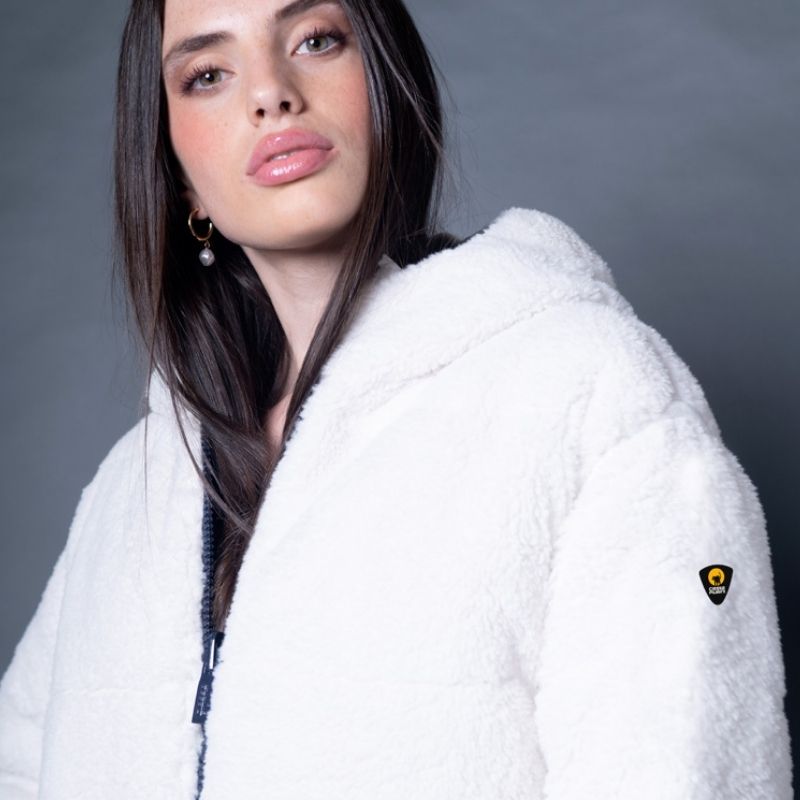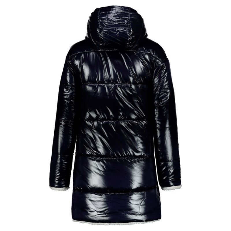 Abrigo reversible para mujer de Ciesse Piumini. De corte recto y con capucha. Dos estilo distintos en una misma prenda. De borreguito color crudo por una cara y acolchado de color azul por la otra.